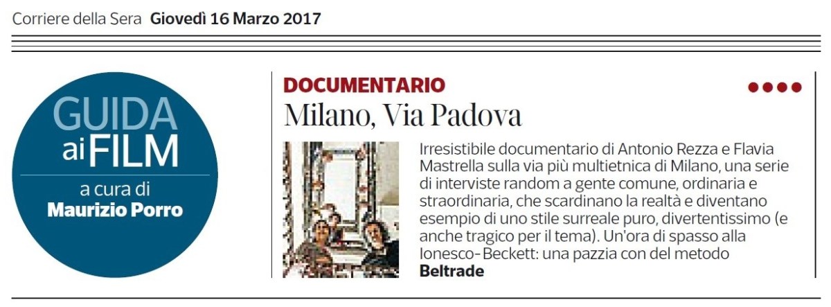 CORRIERE DELLA SERA – M.PORRO Pubblicato: 27 luglio 2017Dimensione originale: 1231 × 455Allegato: Altra anteprima regionale a Cortosplash, “Milano, via Padova” di Flavia Mastrella e Antonio Rezza sarà l’evento speciale della seconda serata « »